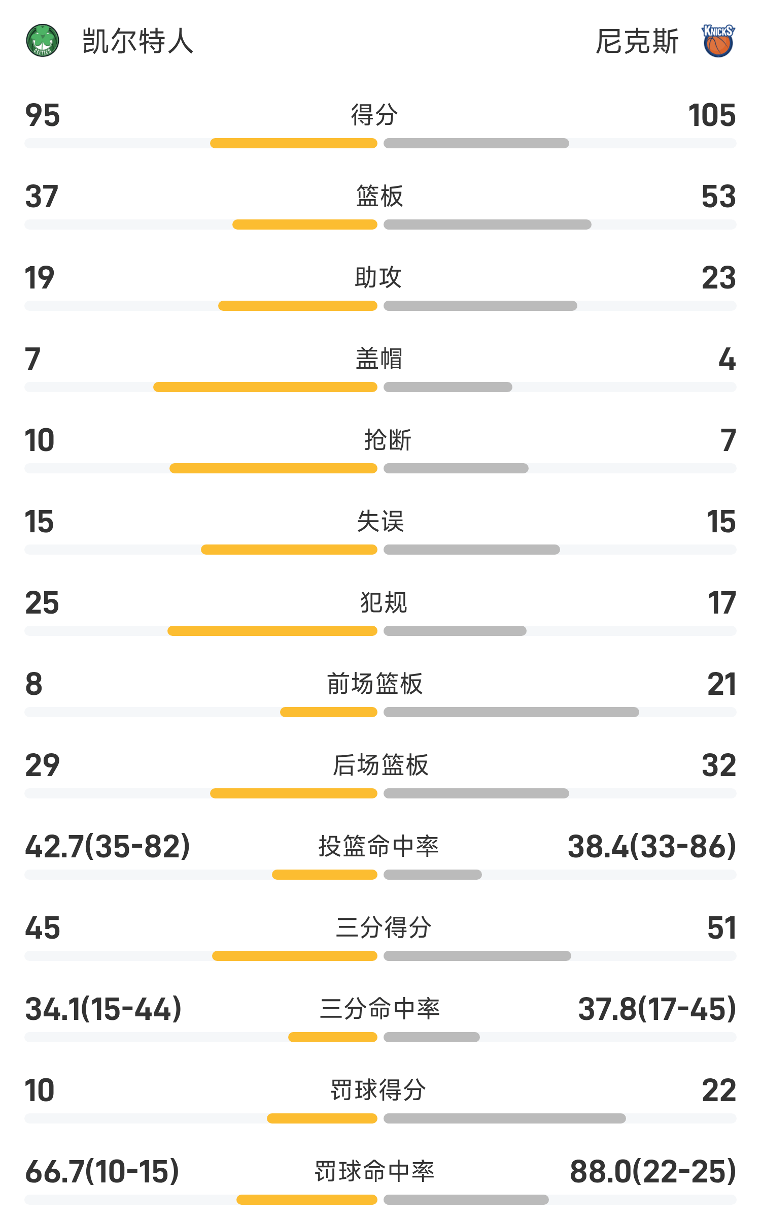 6686体育app10月25日讯 25/26赛季NBA常规赛,尼克斯对阵凯尔特人。双方全场战罢,尼克斯105-95战胜凯尔特人。布伦森砍下全场最高的31分3板5助,率领尼克斯胜利取胜。