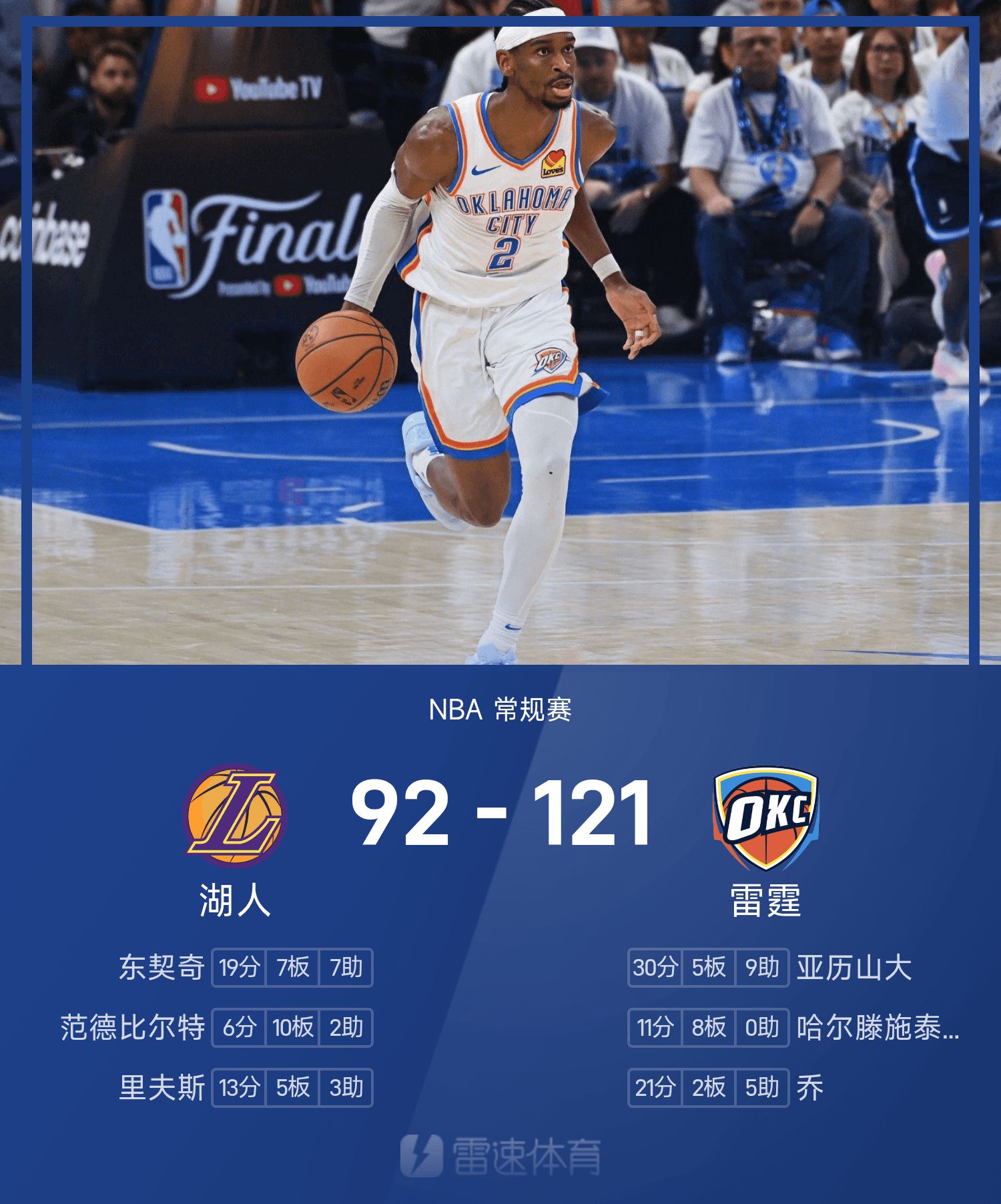 NBA战报:亚历山大30分9助,雷霆121-92大胜湖人
