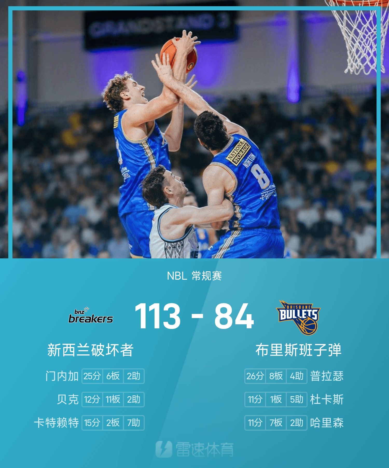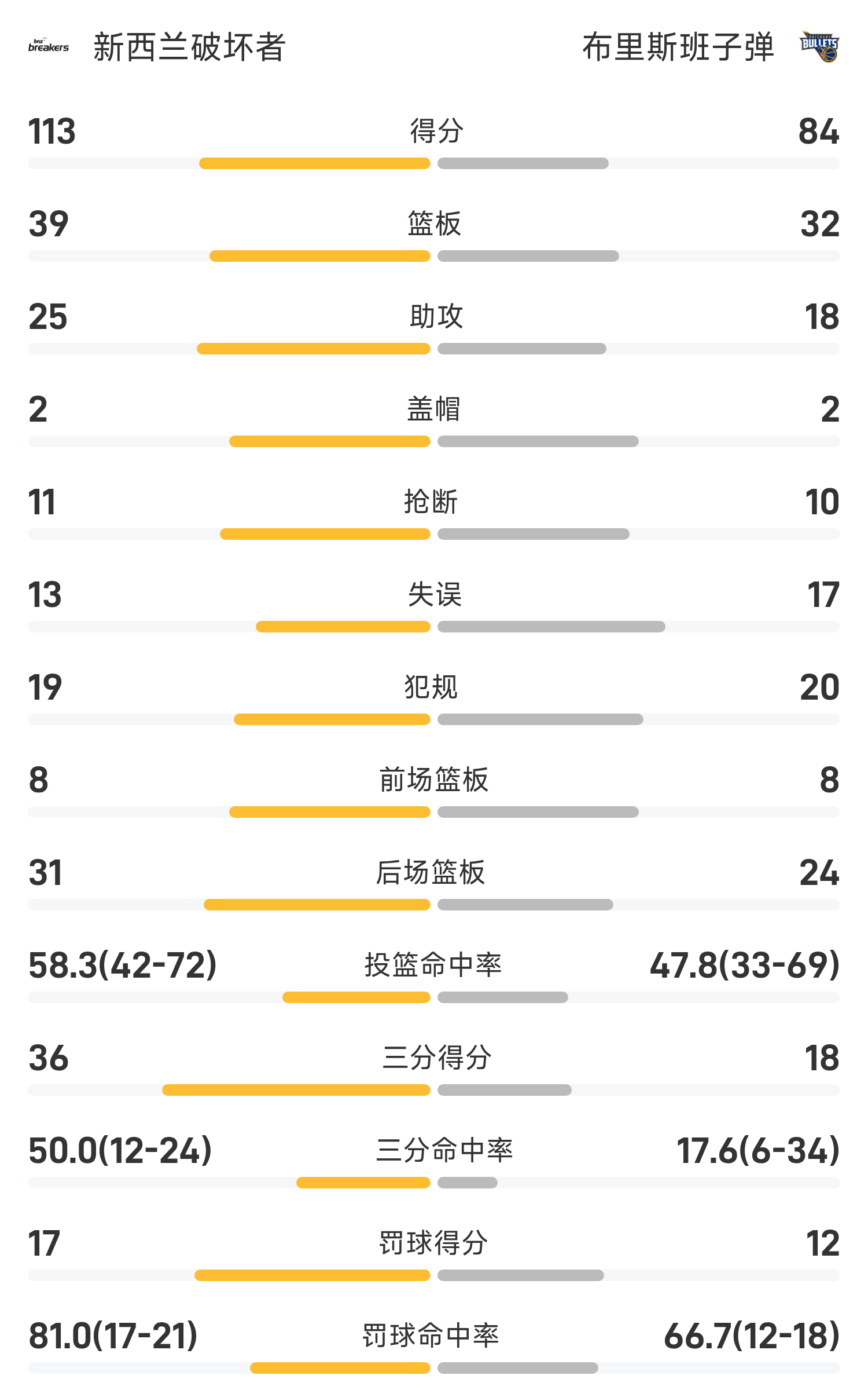 双方全场战罢,布里斯班子弹84-113不敌新西兰毁坏者。