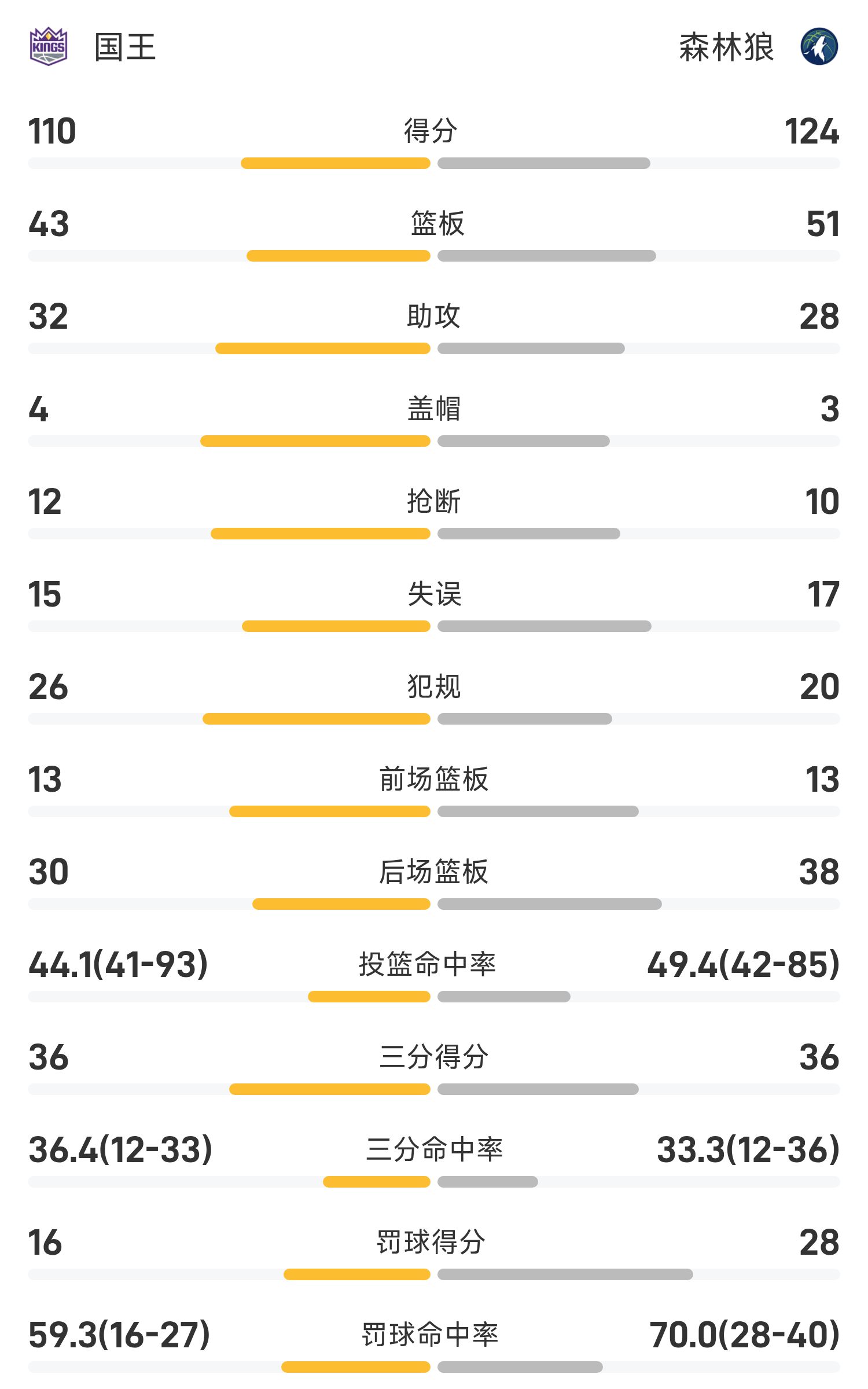 双方全场战罢,森林狼124-110战胜国王。