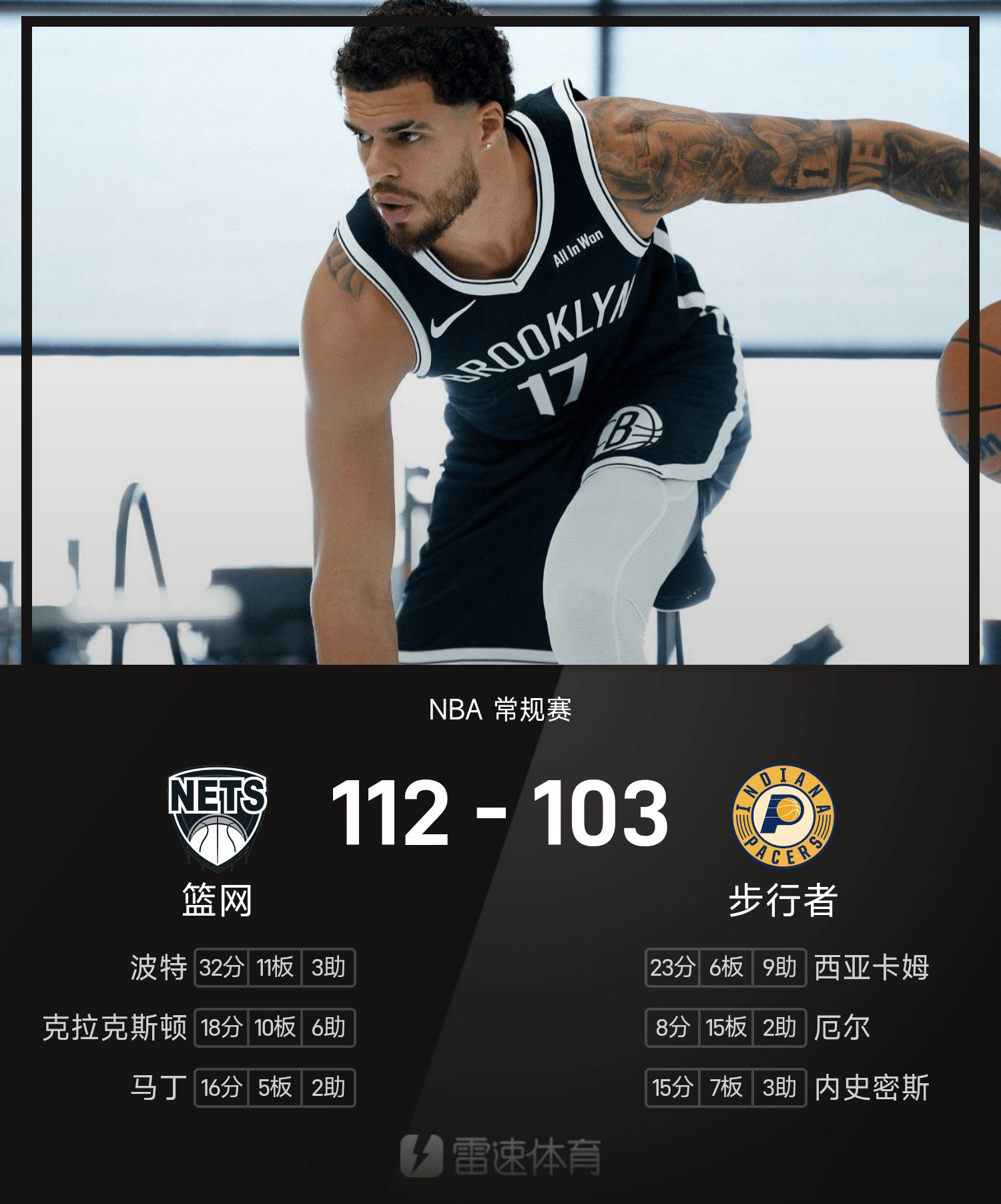 小波特32分11抢篮板,篮网末节逆转步行者终结七连败,获得赛季首胜。
