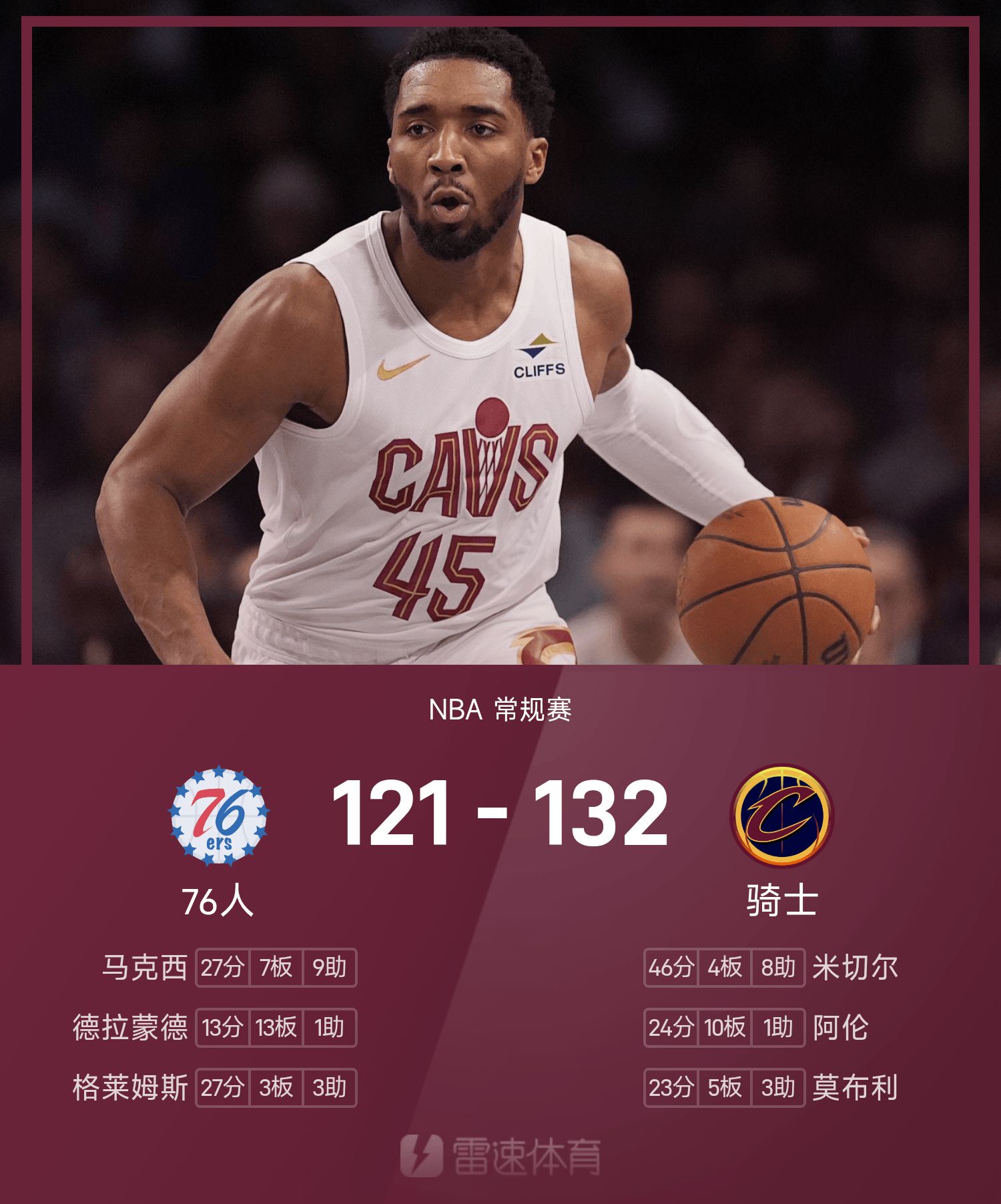 米切尔爆砍赛季新高46分,骑士主队场击退76人。
