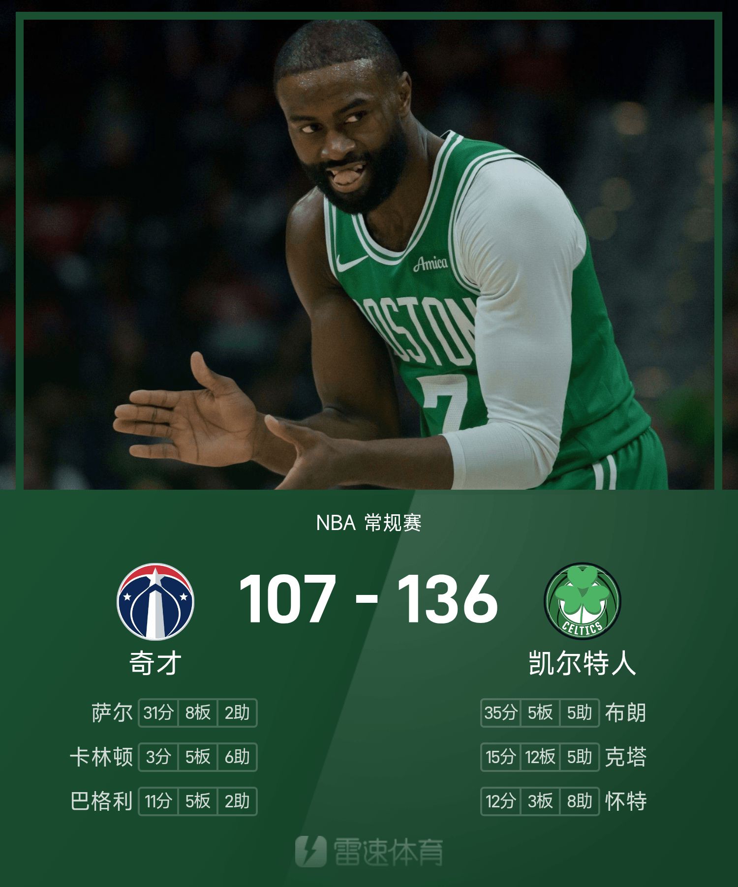 杰伦·布朗独得35分,凯尔特人6人得分上双大胜奇才。