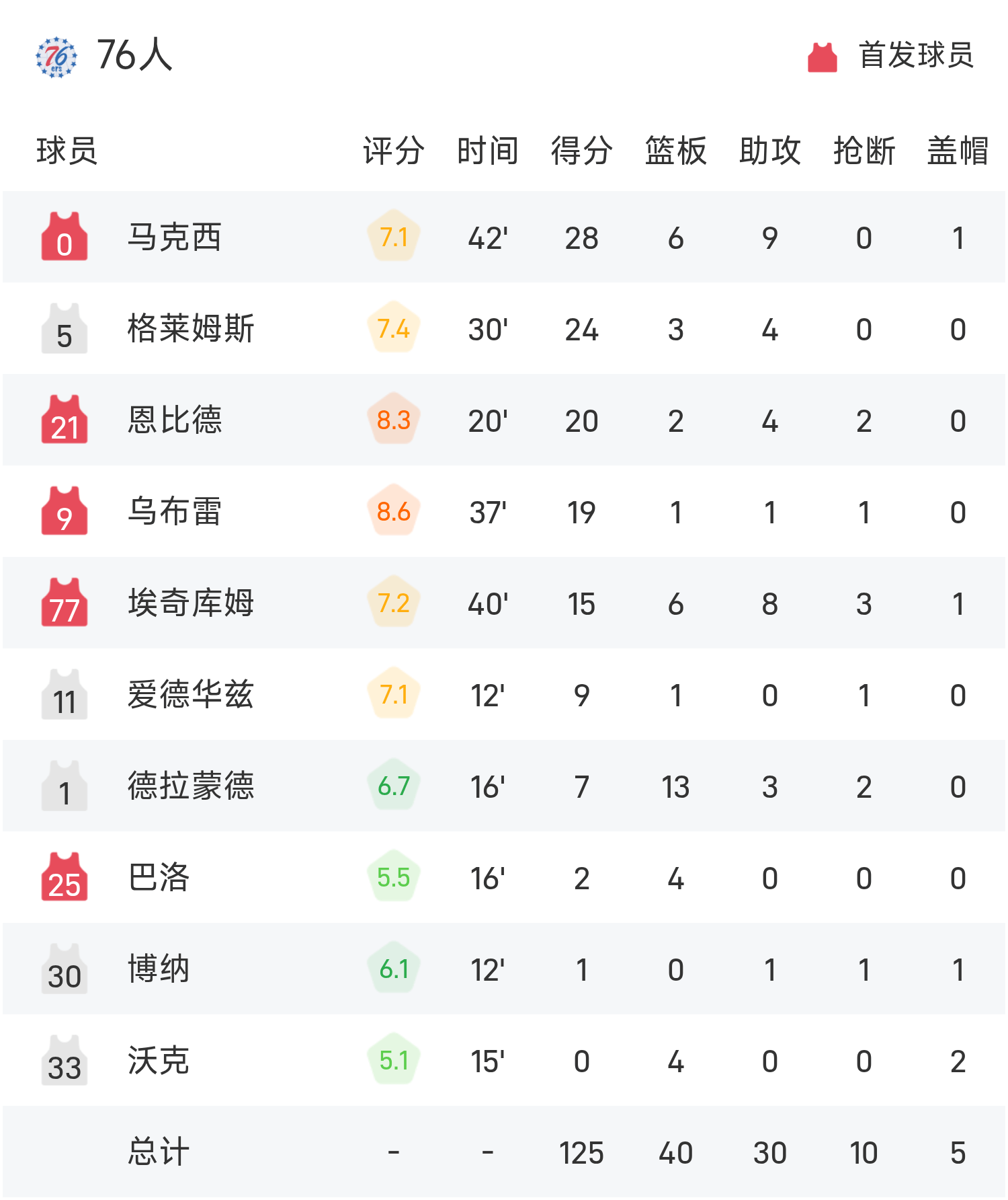 马克西得到28分6板9助率领76人胜利取胜,鲍尔砍下27分9板8助难阻败北局。