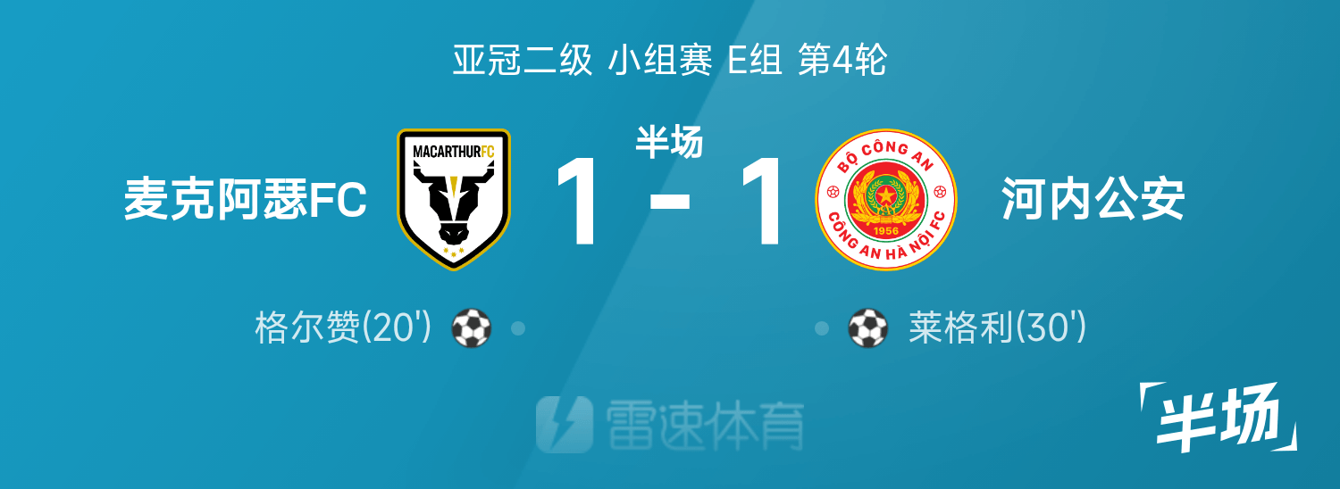 亚冠二级半场:格尔赞破门,莱格利扳平局,麦克阿瑟1-1河内