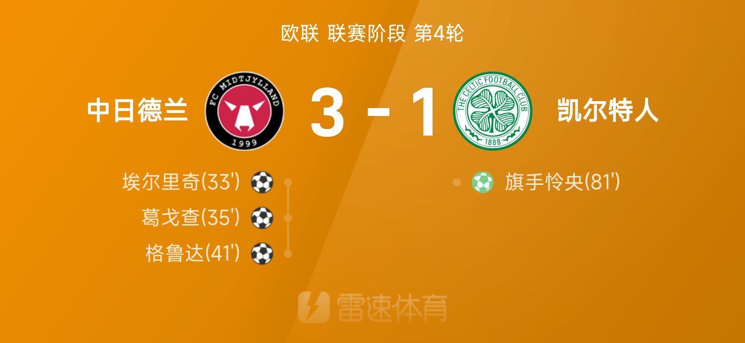 6686体育app11月07日讯 25/26赛季欧联联赛事阶段第4轮,中日德兰3-1战胜凯尔特人。全场竞赛,葛戈查发挥出色贡献1射1传,格鲁达、埃尔里奇破门建功,旗手怜央破门难救主。